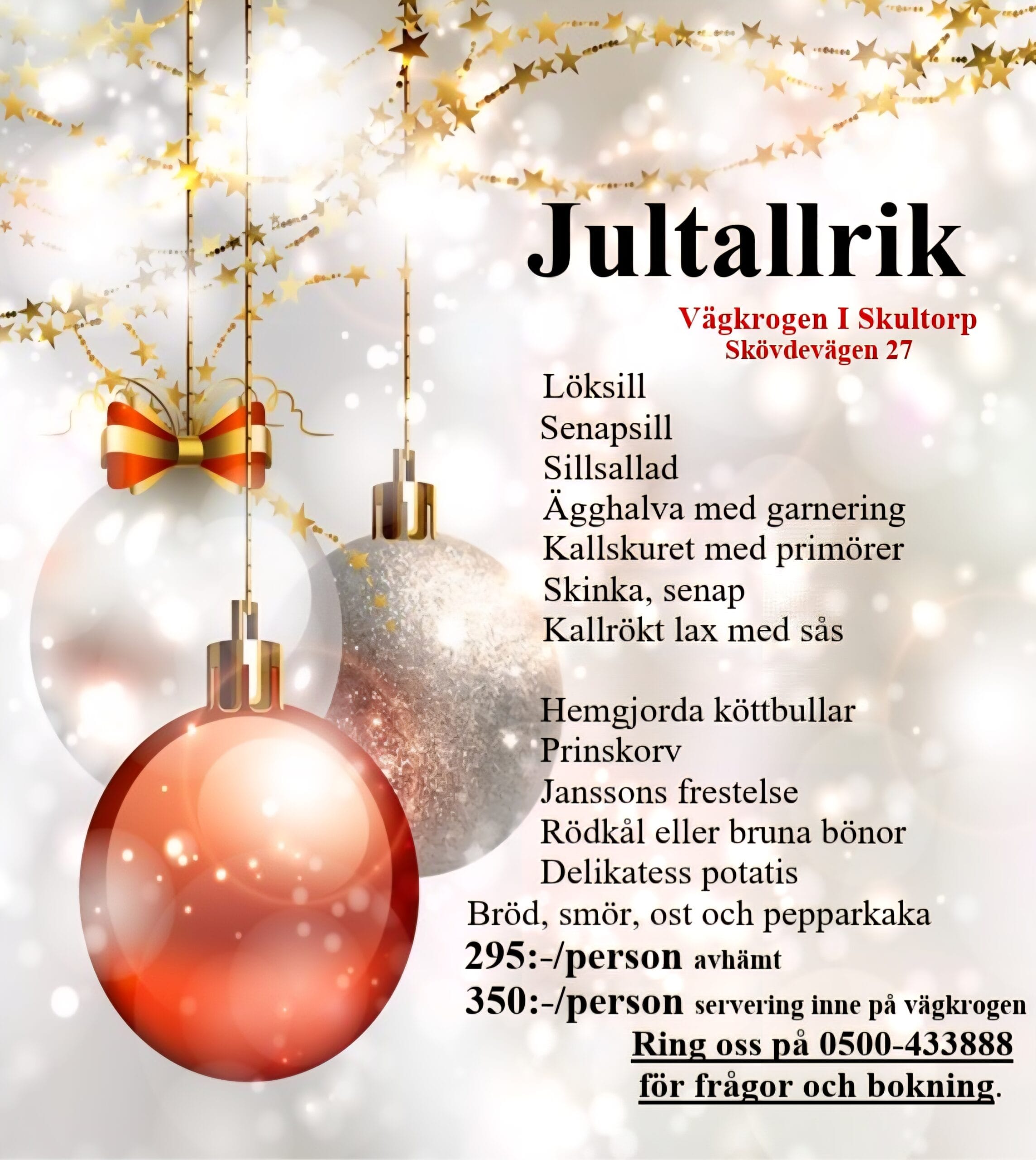 Välkommen till Vägkrogen i Skultorp! Våra öppettider mån-fre 09-14.30. Frukost: 09-10.30 Lunch:11-14.30 Lördag: 11-15. Söndag 12-15 Vi serverar dagens lunch 7 dagar i veckan. Vi gör smörgåstårtor efter beställning, catering, servering och mycket mer.